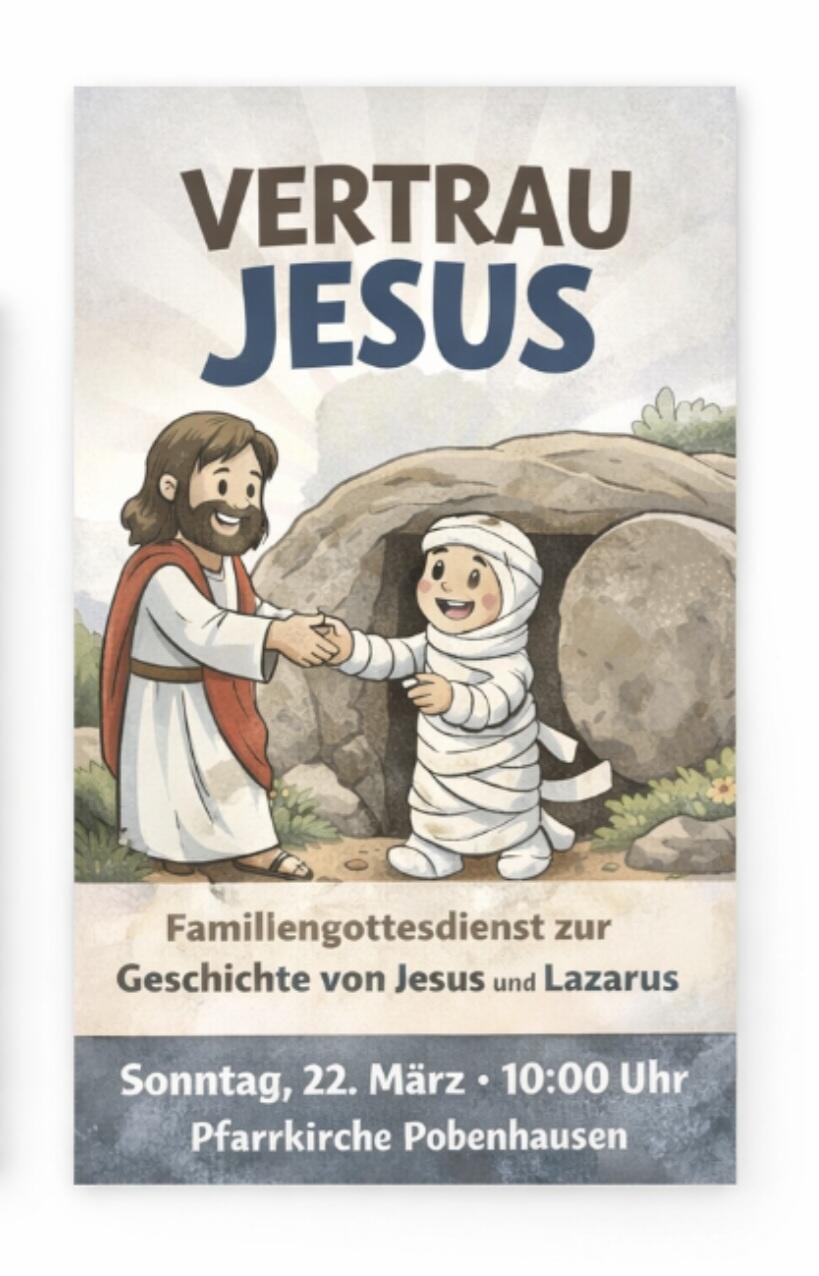 22 März Familiengottesdienst Sonntag 22.03.2026 10:00 Uhr Familiengottesdienst in Pobenhausen zur Geschichte von Jesus und Lazarus "Vertrau auf Jesus" Familiengottesdienst Besondere Gottesdienste Jugendgottesdienst Kindergottesdienst Ostern Veranstaltungsart Gottesdienst Zielgruppe Familien, Jugendliche, Kinder, Mütter, Väter